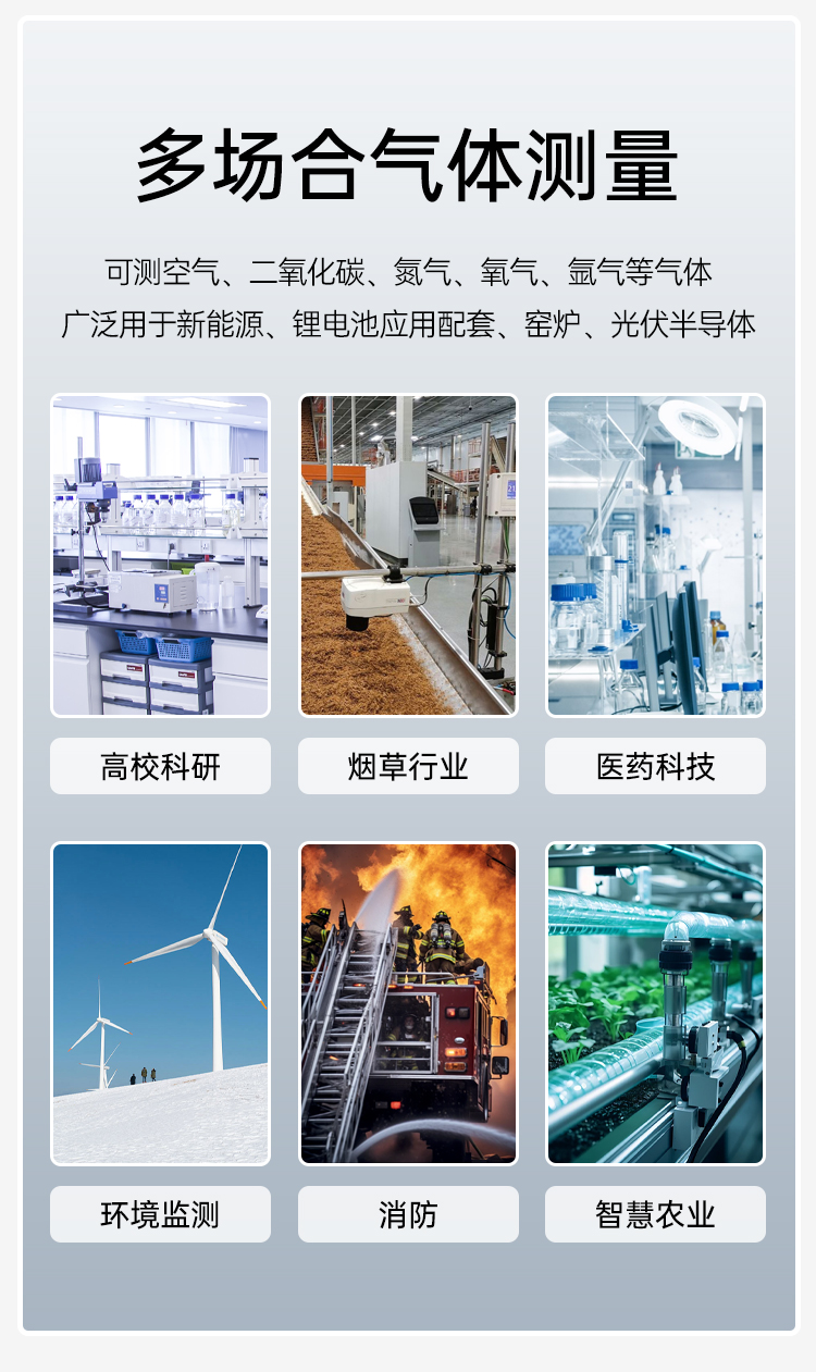 可測空氣、二氧化碳、氨氣、氧氣、氬氣等氣體廣泛用于新能源、鋰電池應用配套、窯爐、光伏半導體