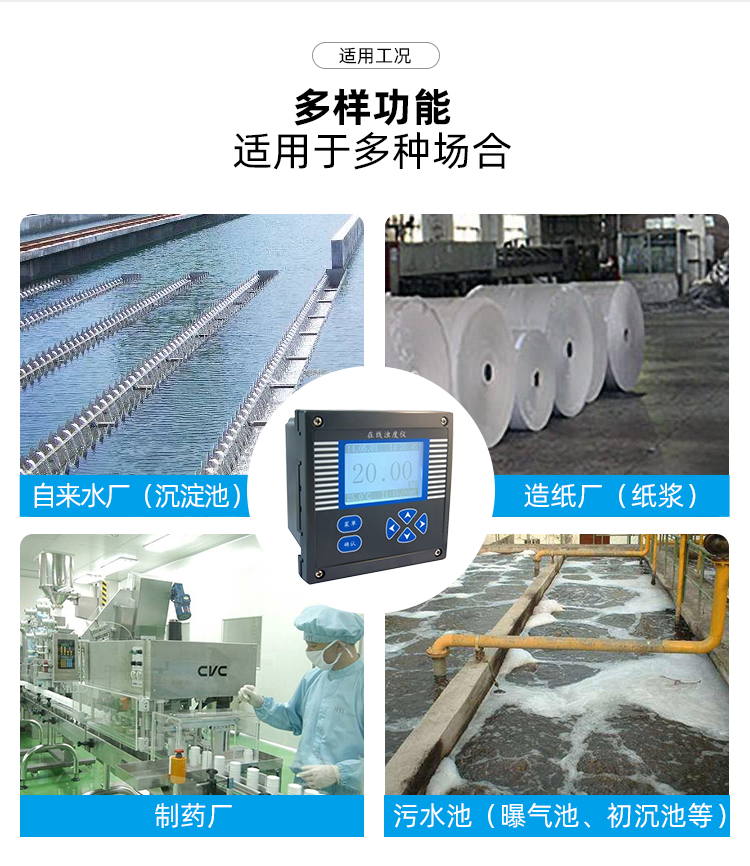 在線污水處理的沉淀池、二沉池、污泥濃縮池的污泥界面測定;自來水廠沉淀池的泥位測定,給水廠(沉淀池)、洗砂廠(沉淀池)、電力(灰漿沉淀池)的泥位測定。